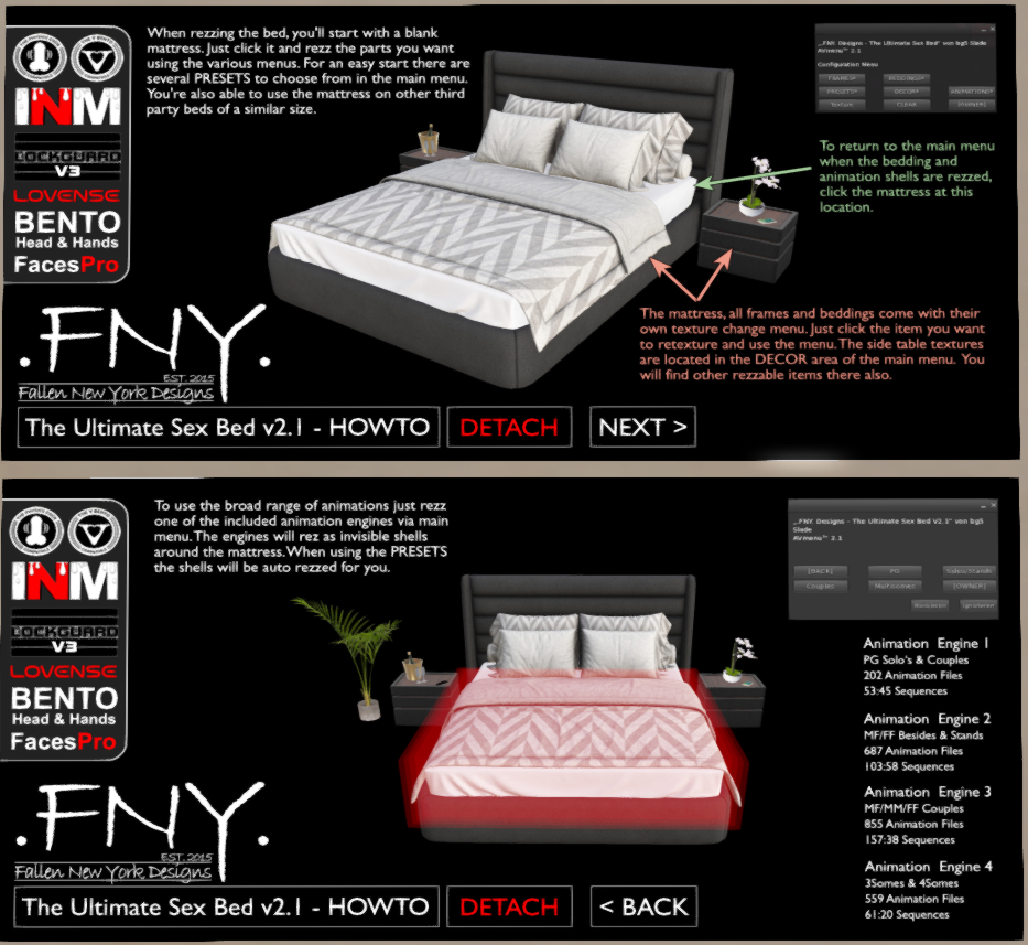 Fallen New York Designs has been making fun and pretty furniture and decor for the Virtual World for a decade! They do great furnishings with animations and have integrated the Lovense Bridge, allowing you to sync your Bluetooth controlled sex toys to what your avatar is doing on the screen. While they have a ton of landscape decor for your scene building pleasure, it’s their X rated sex furniture that has my attention now. The Ultimate Sex Bed kicks off their super loaded offerings, and has been followed by the Ultimate Sex Sofa-Bed, and the Ultimate Sex Sofa (a sectional that seats up to SIX avatars and accommodates group sex parties!)